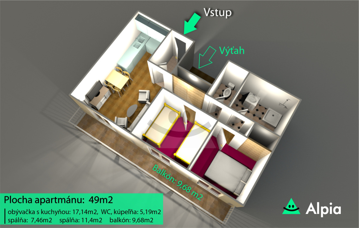 Biuro nieruchomości ALPIA Reality oferuje na wyłączność na sprzedaż apartament o powierzchni 49,14 m² z balkonem o powierzchni 9,86 m² w obiekcie "Apartmánový dom 188", zaledwie 5 minut spacerem od stacji początkowej wyciągu Lúčky – Vyhliadka w ośrodku narciarskim Jasná.