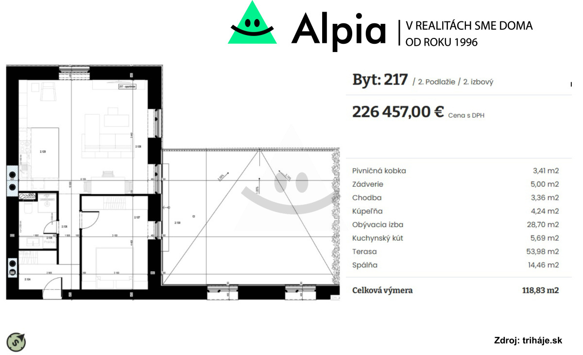 Terasa: 53,98 m2 - Výstup na západne orientovanú terasu z hlavnej spálne aj obývacej izby.